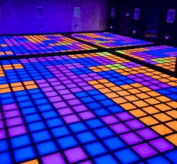 une salle de 30 m² dont le sol est constitué de 320 dalles tactiles et lumineuses de couleurs différentes.